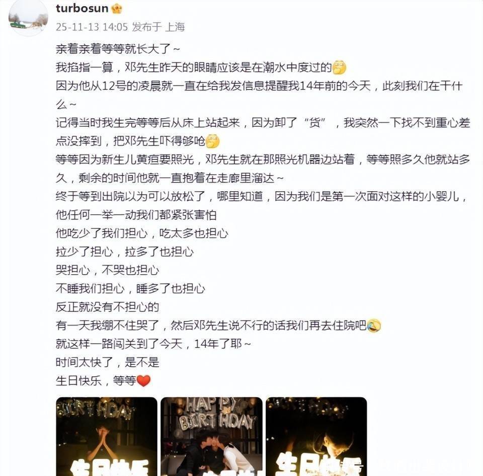 邓超孙俪几个月前被传全家移民英国,当时孙俪澄清只是去旅游,还晒出陪儿子打篮球的照片。最近两人生活继续按自己的节奏过。11月13号孙俪在社交平台给儿子等等过14岁生日,说到孩子出生时差点摔倒,邓超手忙脚乱的场景。两人还复刻了当年的合影姿势,邓超亲儿子脸颊的照片被网友调侃"脸上都变形了"。